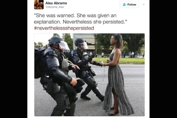 Esta foto icónica de una mujer joven de pie contra la policía antidisturbios durante un asunto de Black Lives en Baton Rouge, LA.
