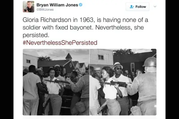 Esta es Gloria Richardson, la líder del Movimiento Cambridge (un movimiento de derechos civiles en Cambridge, Maryland). Está subtitulado: Gloria Richardson en 1963, no tiene ninguno de un soldado con bayoneta fija. Sin embargo, ella persistió.