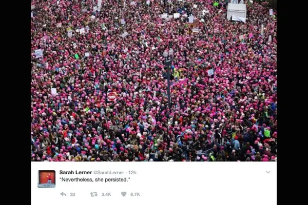 Esta foto es de la Marcha de las Mujeres del 21 de enero y está subtitulada con, sin embargo, ella persistió.