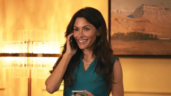 Sarah Shahi como Zahra Bankston en el rojo y blanco de primer video