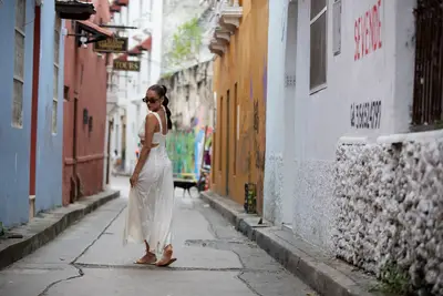 Disparo de separación: Secretamente vine aquí buscando una espiritualidad instantánea, pero lo que aprendí fue que no puedes hackear la vida lo que es sagrado, tienes que rendirte a ella, dice Mitchell por un montaje de lugares que visitó en Perú. Luego revela dónde la llevará su próximo episodio, Cartagena, Colombia.