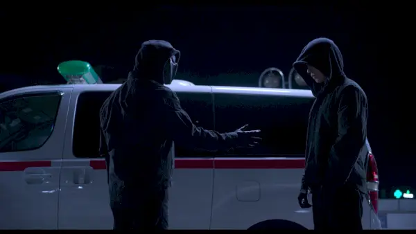 Ji-yong, habiendo presenciado la fuga, sorprende y deleita a su imitador saltando a la ambulancia mientras ésta avanza. Exige saber quién es el Vigilante enmascarado, pero solo recibe un alegre: ¡Encantado de conocerte, Ji-yong-ah! en respuesta. El Vigilante Enmascarado conduce erráticamente hacia un estacionamiento desierto. Se vuelve fanático un poco más y luego explica que ha estado limpiando los desechos de Ji-yong para evitar que lo atrapen. Temblando de emoción, se ofrece a actuar como compañero de Ji-yong para que puedan cazar presas aún más grandes juntos.