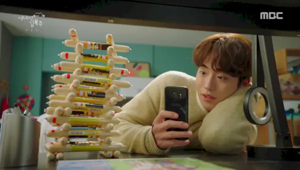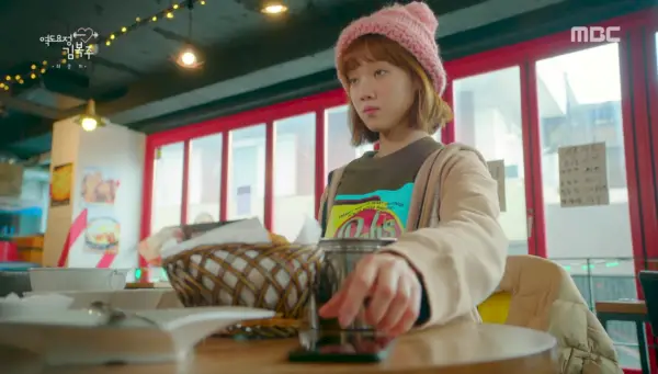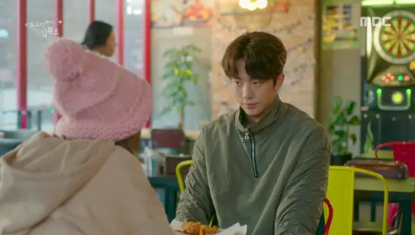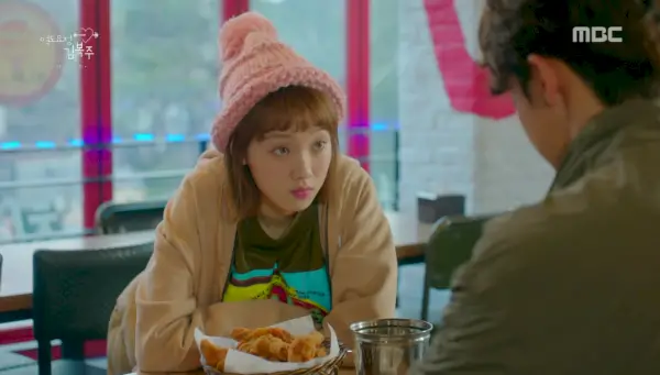 No lo piensa muy bien y pronto Bok-ju lo mira fijamente por encima de una canasta de... pollo frito. NO . Ella ya sospecha de todo lo que él dice, a pesar de que él intenta ser adorable para distraerla.