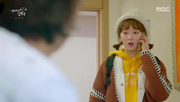 Por supuesto, es solo Dae-ho, haciéndole saber que él y papá están de camino a casa y necesitan que detenga a Bok-ju durante treinta minutos más. Pero Bok-ju está seguro de que está hablando con una chica y ella se le acerca sigilosamente mientras él todavía está hablando por teléfono. JAJAJA, su cara, es carne muerta.