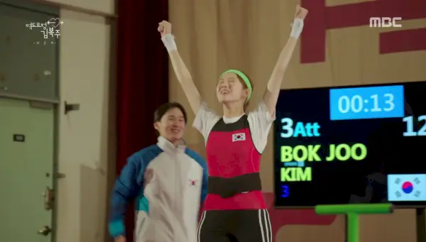 Finalmente llega el día de la competencia en China y Bok-ju se prepara mentalmente para su turno de levantar pesas. Se da una charla de ánimo en silencio, diciéndose a sí misma que hay mucha gente en casa que la ama y la anima. Se dice a sí misma: Kim Bok-ju, ¡tú puedes hacerlo!
