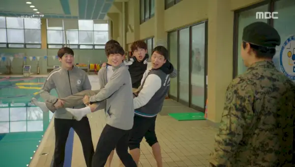 Las novatadas continúan en el pabellón de natación, mientras Joon-hyung amenaza a sus hoobaes con no arrojarlo a la piscina completamente vestido. Tae-kwon aparece, vestido con su uniforme militar, y los ayuda a mojar a Joon-hyung y luego lo arrojan él mismo.