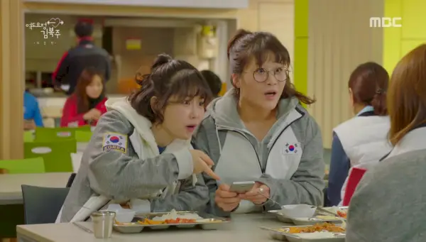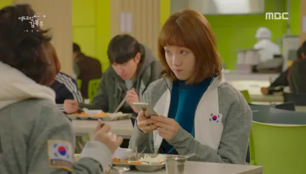 Él le dice que se concentre sólo en entrenar y llevarse a casa la medalla de oro. Ellos juegan el Tú vas primero, no, tú vas primero. juego, y Joon-hyung sigue enviando a Bok-ju pero negándose a soltarla. Qué lindos, estos dos.